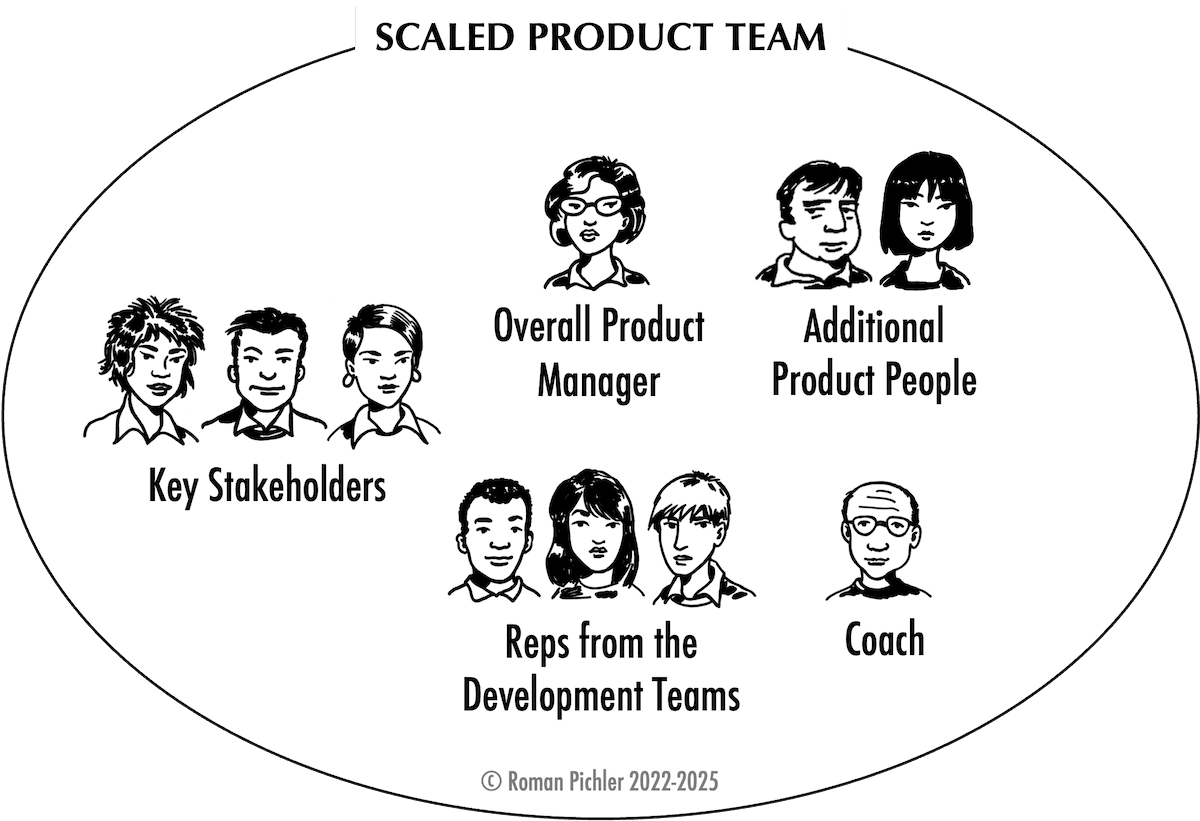 For products that are so large that they cannot be managed by a single product manager, the product team should be enlarged. It should now include the product manager, the key stakeholders, representatives from the development teams, as well as the additional product people required to manage the product, as Figure 4 shows.