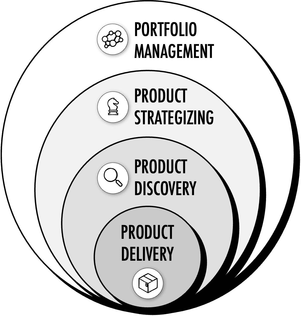 The three processes discussed so far focus on a single product. But most products don’t exist in isolation. They are part of a product portfolio. Examples include not only commercial products like Microsoft 365 and Adobe Creative Cloud, but also in-house developed finance and HR tools. To maximise the overall value the portfolio creates, it must be proactively managed. Part of this is creating and evolving a portfolio strategy and setting portfolio-wide outcomes/OKRs.[17] For more advice on portfolio management, see my articles The Product Portfolio Matrix, Everything You Need to Know About Product Portfolio Strategy, and Succeeding with Portfolio Roadmaps.