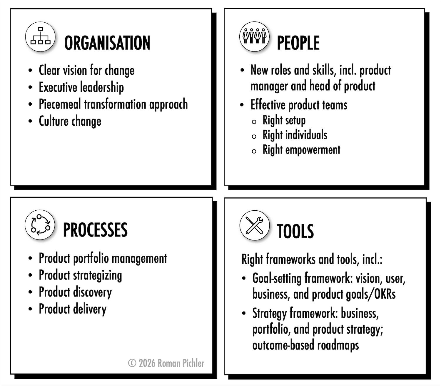 Out of the four aspects, organisation is the most important one, followed by people. You can, for example, implement an awesome product discovery process and build amazing Opportunity Solution Trees. But if the necessary organisational changes aren’t taking place and product teams aren’t effectively set up and adequately empowered, you won’t be able to fully establish the product model and reap all its benefits.[4] Instead, you are likely to end up with a halfway house between the old and the new world, where product managers struggle to do a good job and create the desired value, as they lack the necessary skills and organisational support.
